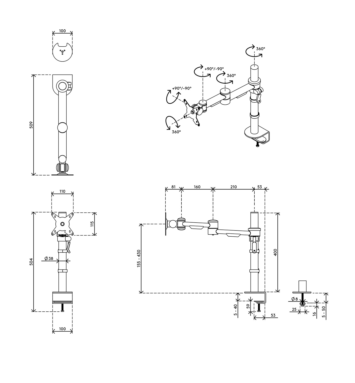 - Monitor: tilt +90°/-90°, swivel +90°/-90°, rotate 360°