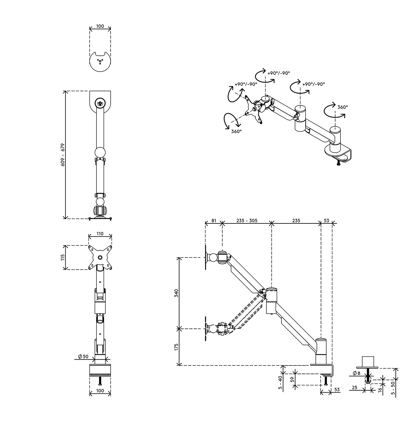 - Monitor: tilt +90°/-90°, swivel 360°, rotate 360°