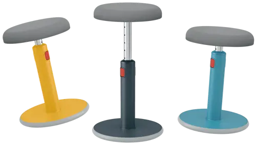 It is an ergonomic stool designed to let you move easily between sitting and standing while you work. Its “2 in 1” feature means it can be used as an active sitting stool at desk height, or raised higher to provide support while you are standing.